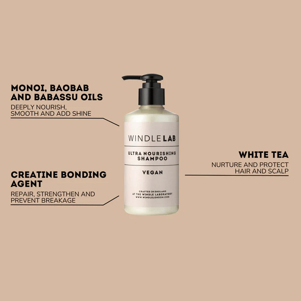 Windle Ultra Nourishing Shampoo contains a creatine complex. This rebuilds disulphide bond that are broken through the bleaching and perming processes. These disulphide bonds are essential for strong hair.